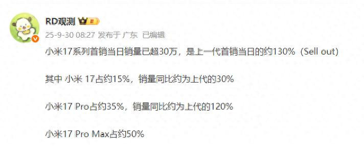 现实中小米17系列用真实的数据给了所有质疑者一个响亮的耳光,9月30日行业人士“RD观测”就给出了小米17系列首销日的数据。根据他提供的数据小米17系列首销当日整体销量已经超过30万台,是一代首销当日的130%。其中小米17占比约15%,是小米16首销日的30%,小米17 Pro占比约35%,是小米15 Pro的120%,小米17 Pro Max占比约50%,由于上代没有这个机型,所以没有对比数据。看到了吗?整体销量还是提升的,比上一代首销日好太多。特别是小米17 Pro系列简直可以用逆天来形容。